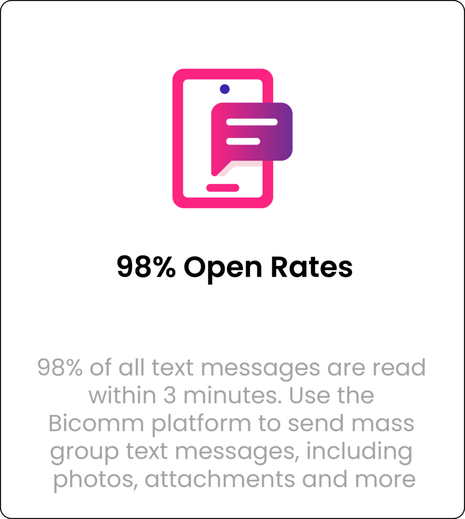 With just a simple click of the button, you can quickly text blast to your entire contact list sending text messages effortlessly. Text messaging has proved to be the most effective form of communication, with an amazing 98% read rate within three minutes of receiving a text message.
